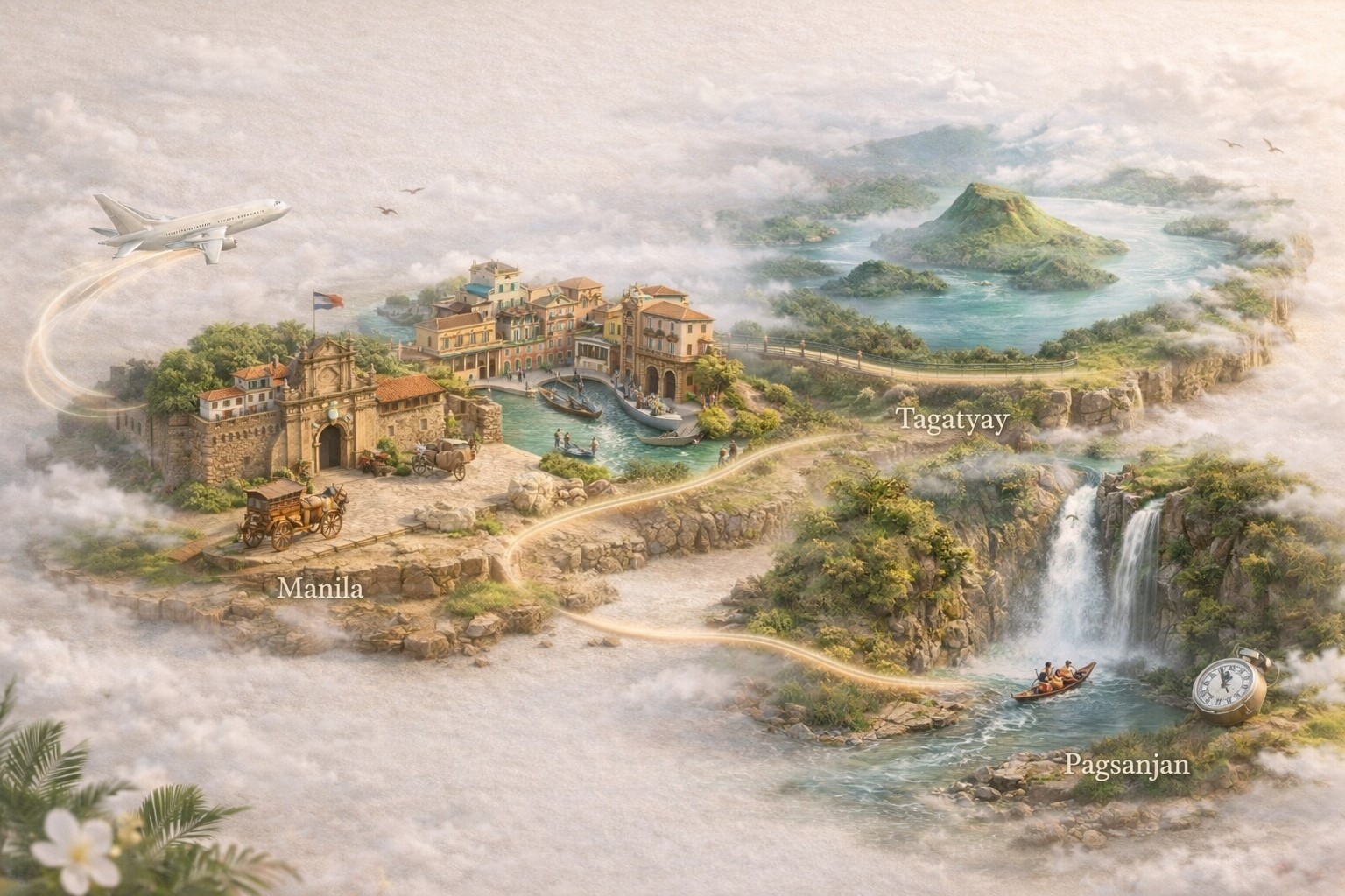 • Nếu Manila là những bản nhạc jazz sôi động và đầy màu sắc lịch sử, thì Tagaytay chính là một nốt lặng đầy thi vị, Quý khách sẽ được đưa lên cao nguyên để hít hà cái không khí se lạnh, nơi tâm hồn được tái thiết lập hoàn toàn và ngắm nhìn một trong những kỳ quan "ảo diệu" nhất thế giới.